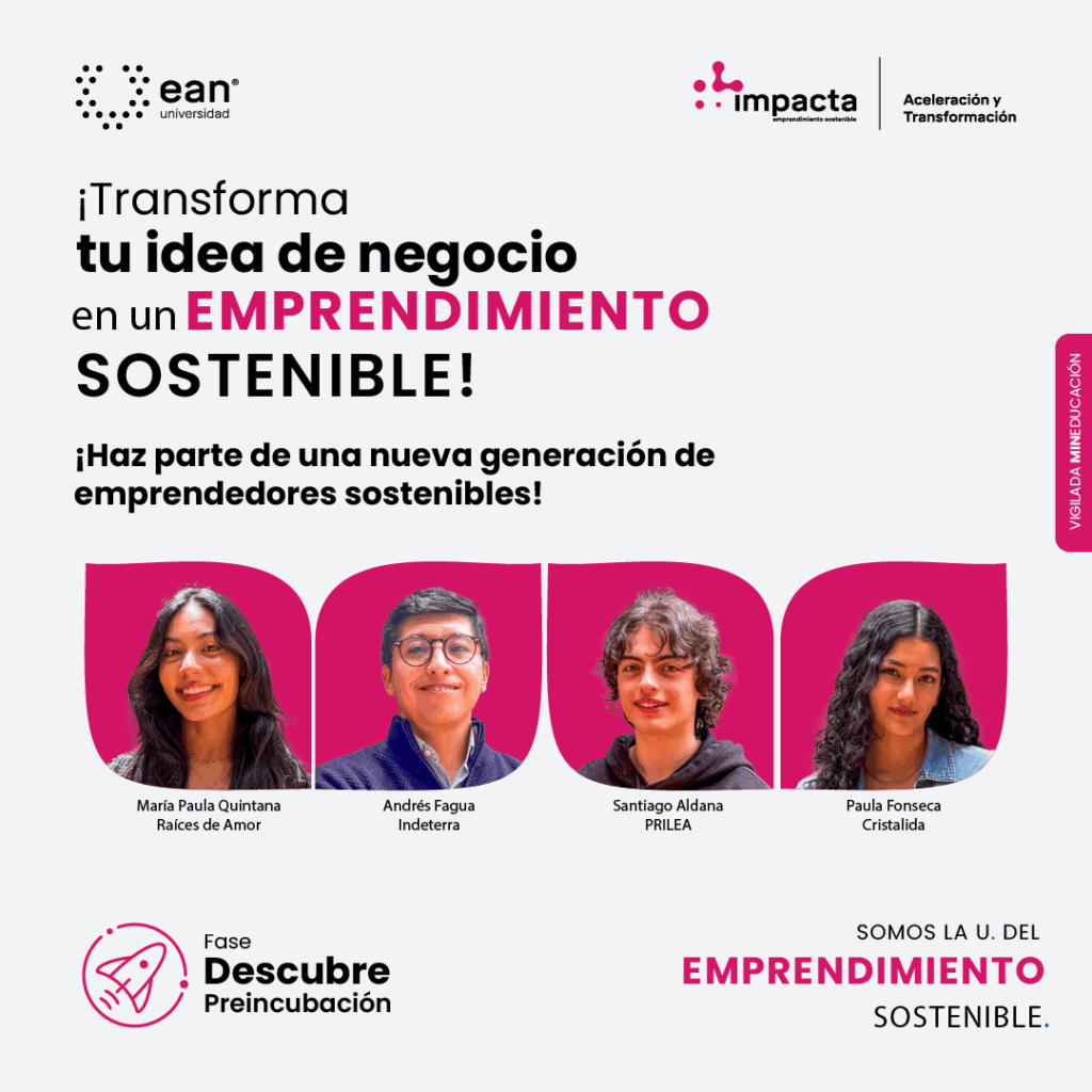 Programa Fase de Preincubación – Descubre II ¿Tienes una idea de negocio sostenible, pero aún no sabes cómo empezar? Ean Impacta te invita a participar en la Fase Preincubación–Descubre, un programa de acompañamiento creado para fortalecer y estructurar tu idea con impacto ambiental, social y económico. ¿A quién está dirigido? Comunidad Eanista: estudiantes, egresados y colaboradores …